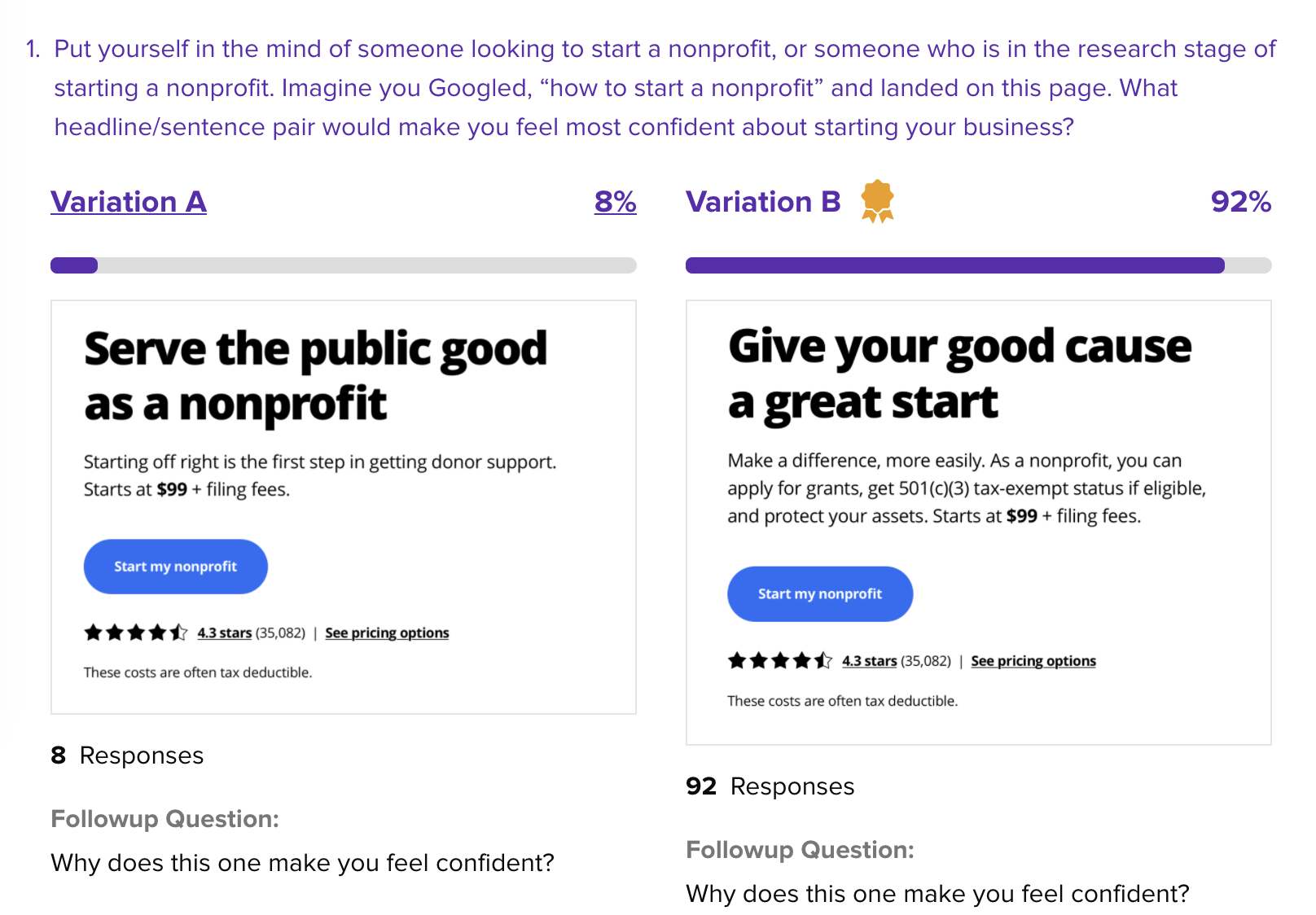 We saw great results after tracking the performance of the new page for two months. Roughly 25% more people started the nonprofit formation flow, and the new page was projected to increase revenue by $2 million per year.