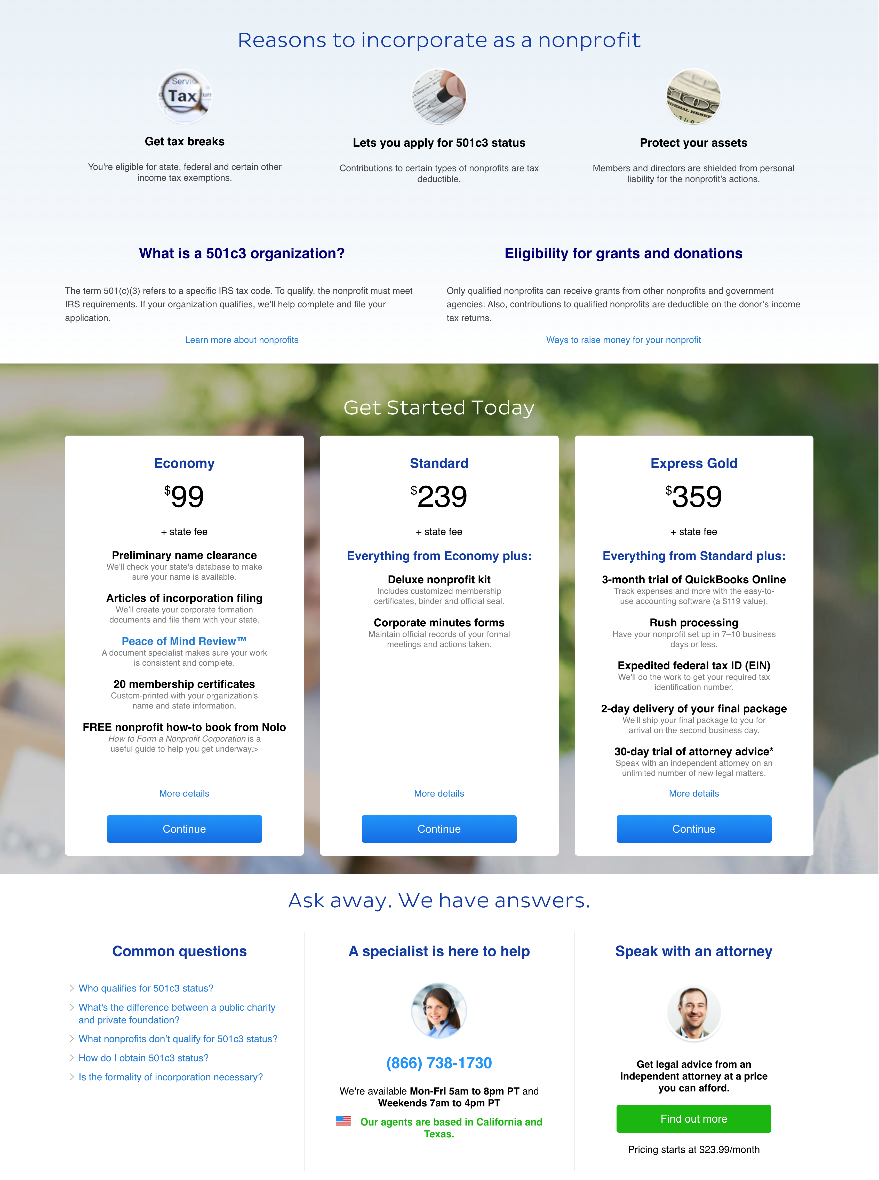 The visual designer and I finalized the page with new messaging validated by A/B testing and a new page layout based on findings from user research (one important addition was a section on the very simple steps to form a nonprofit with LegalZoom).