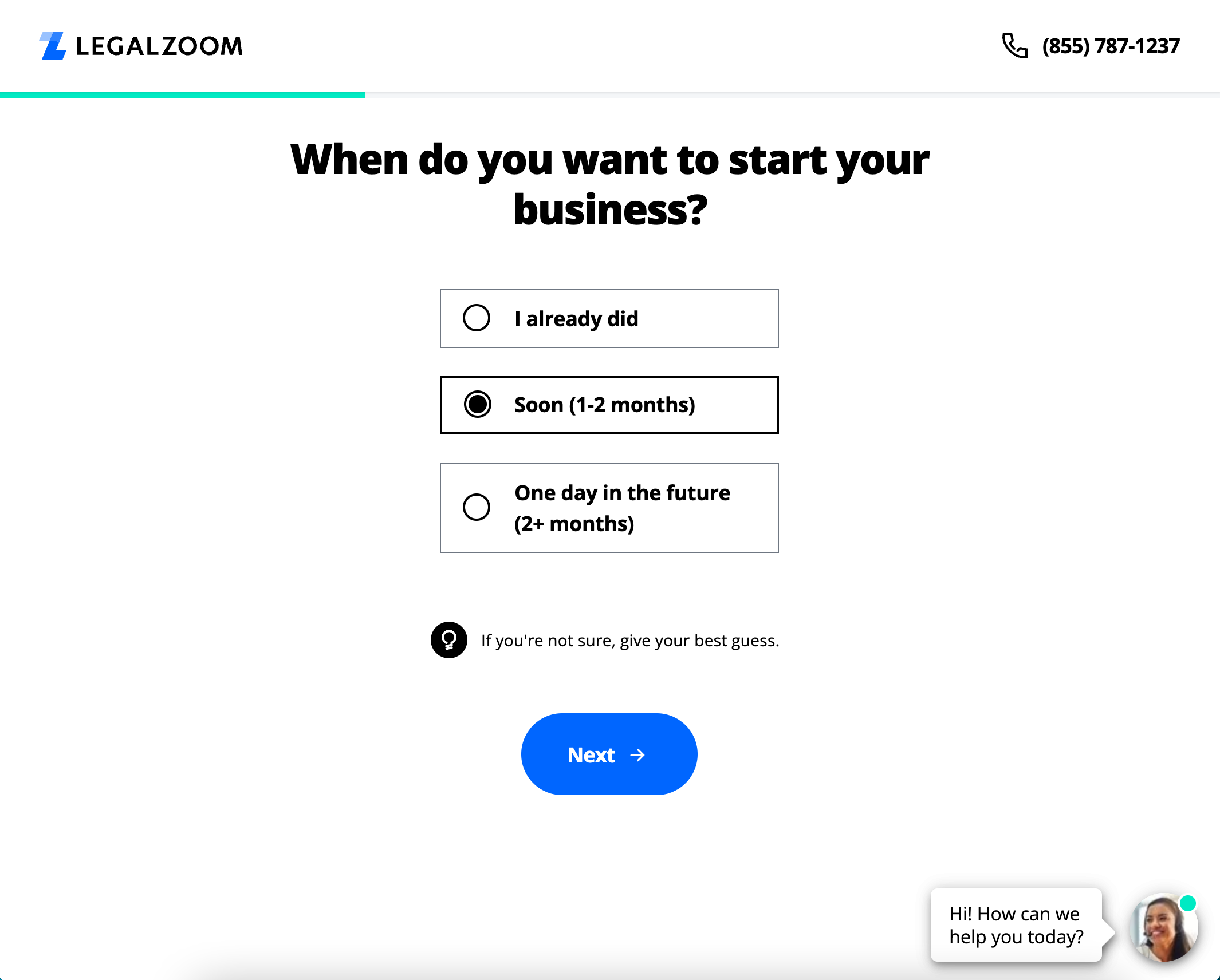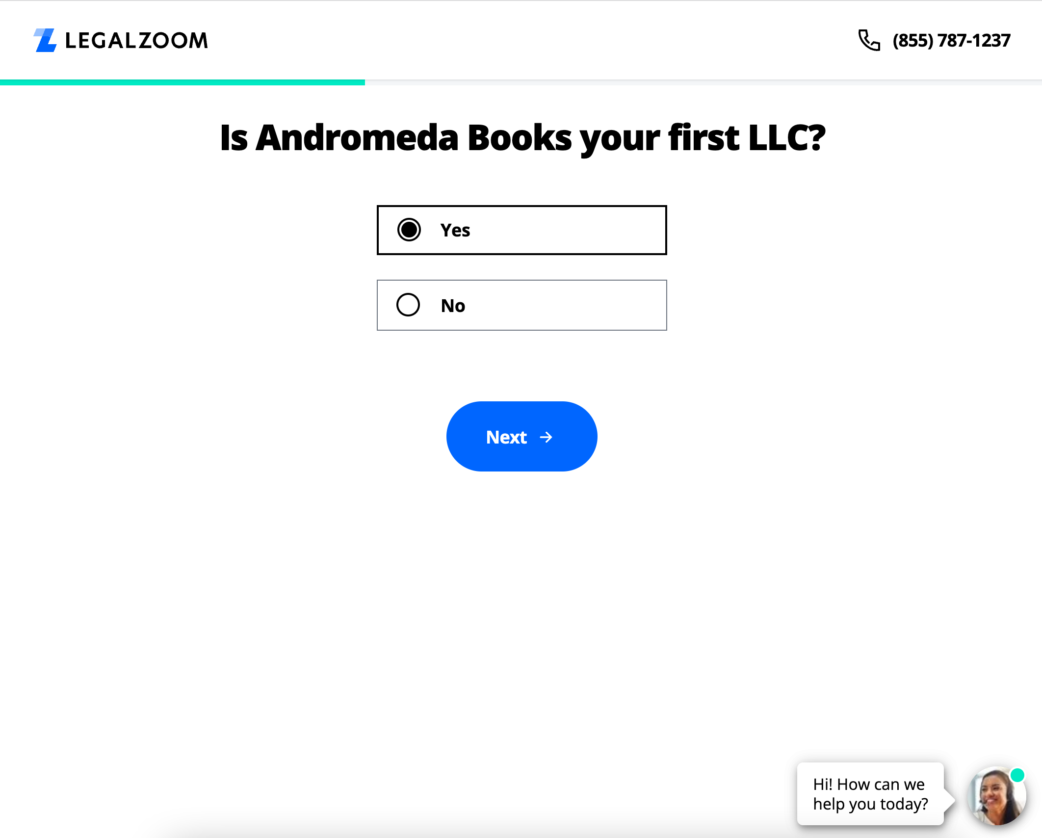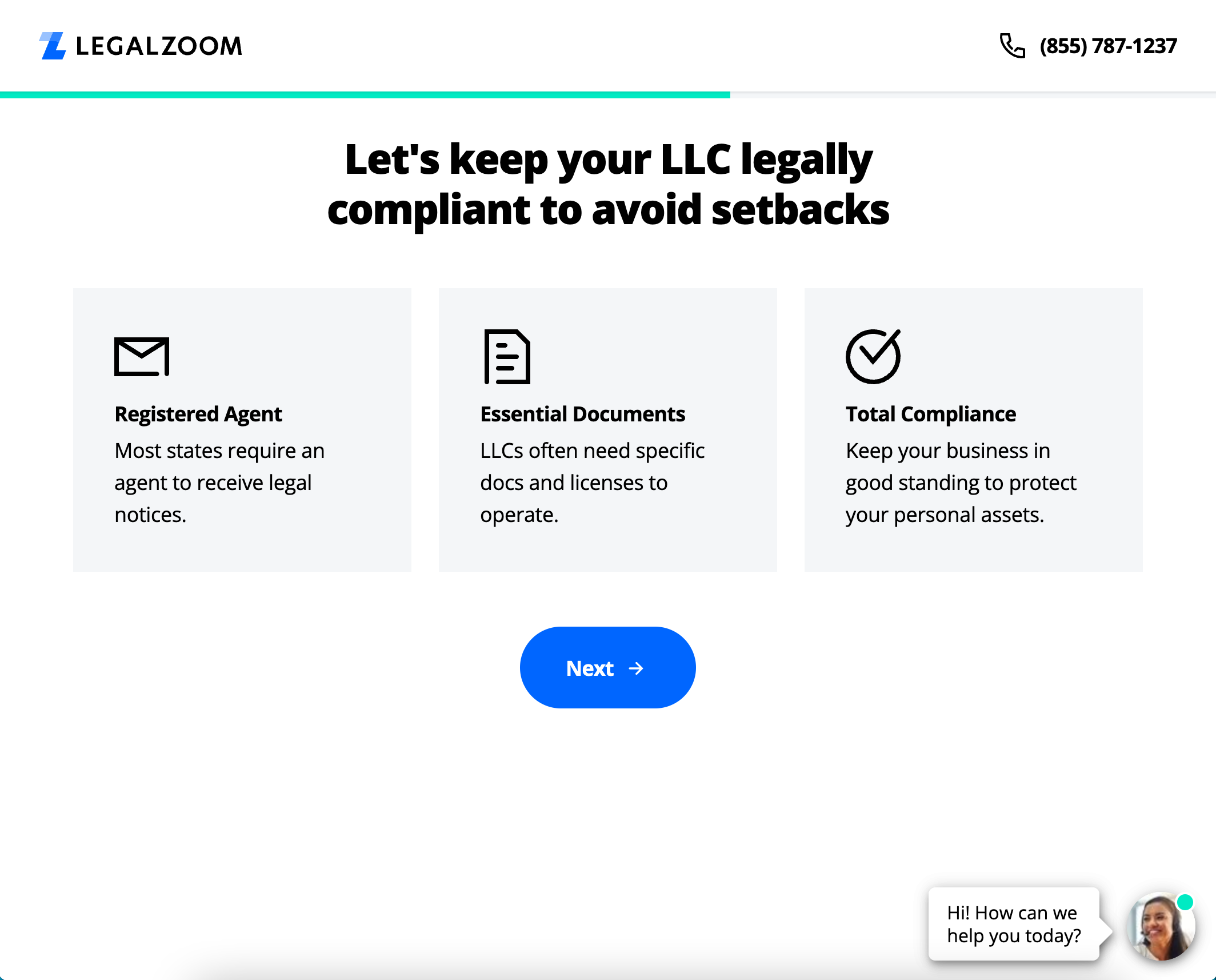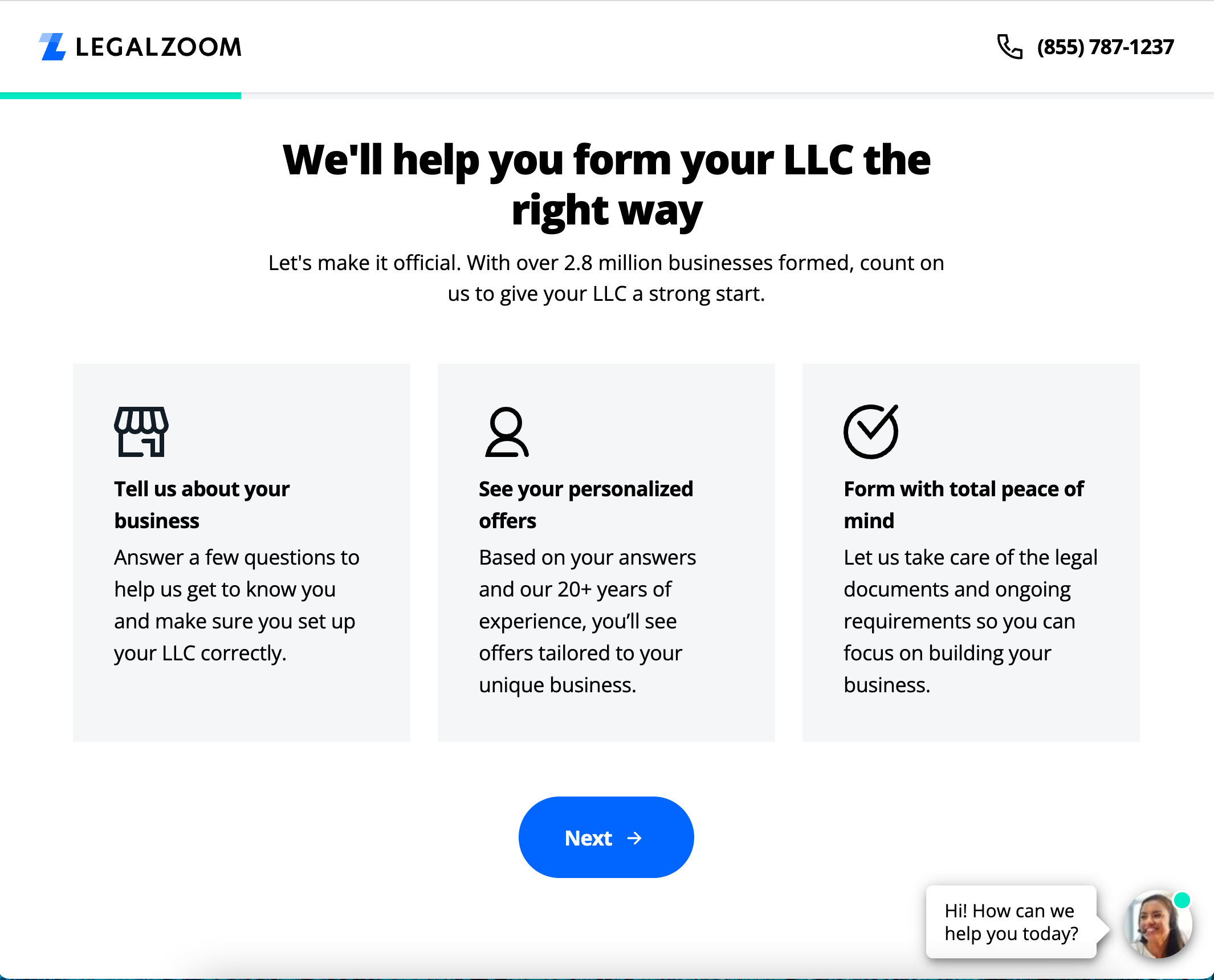 LegalZoom’s flow for forming a new LLC (limited liability company). A user would start this flow after entering their business name on a product marketing page: