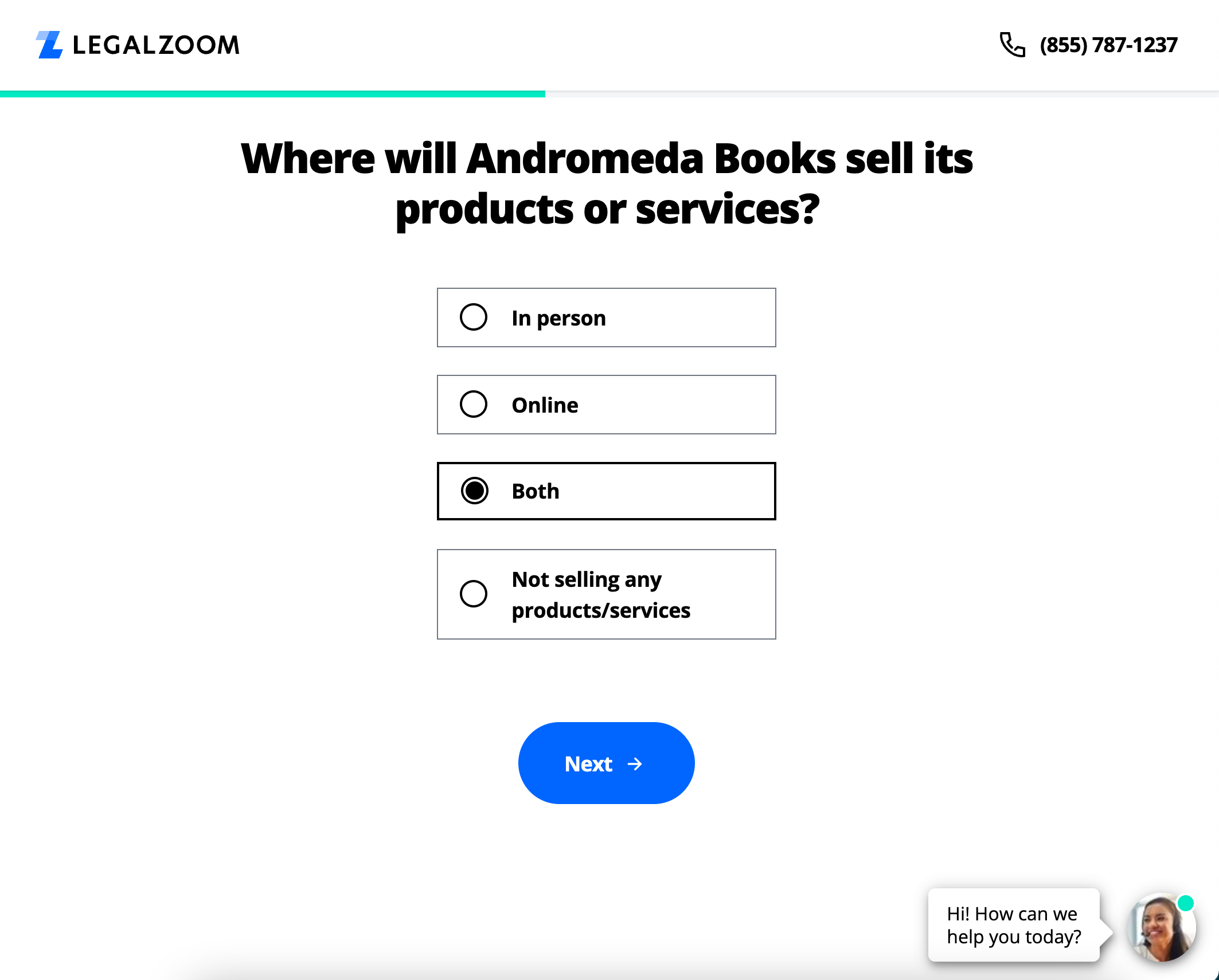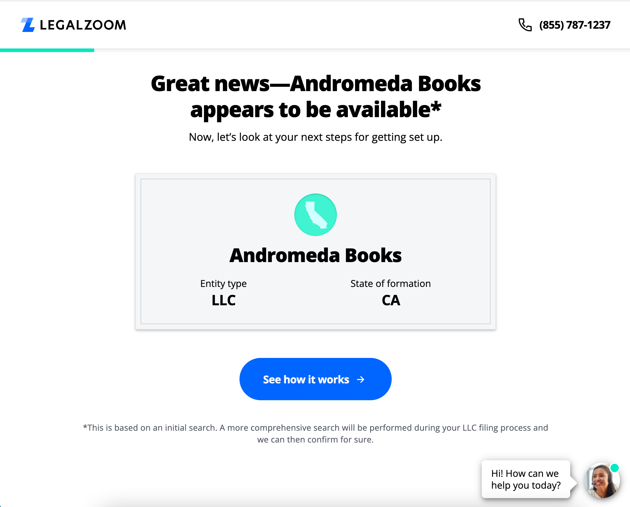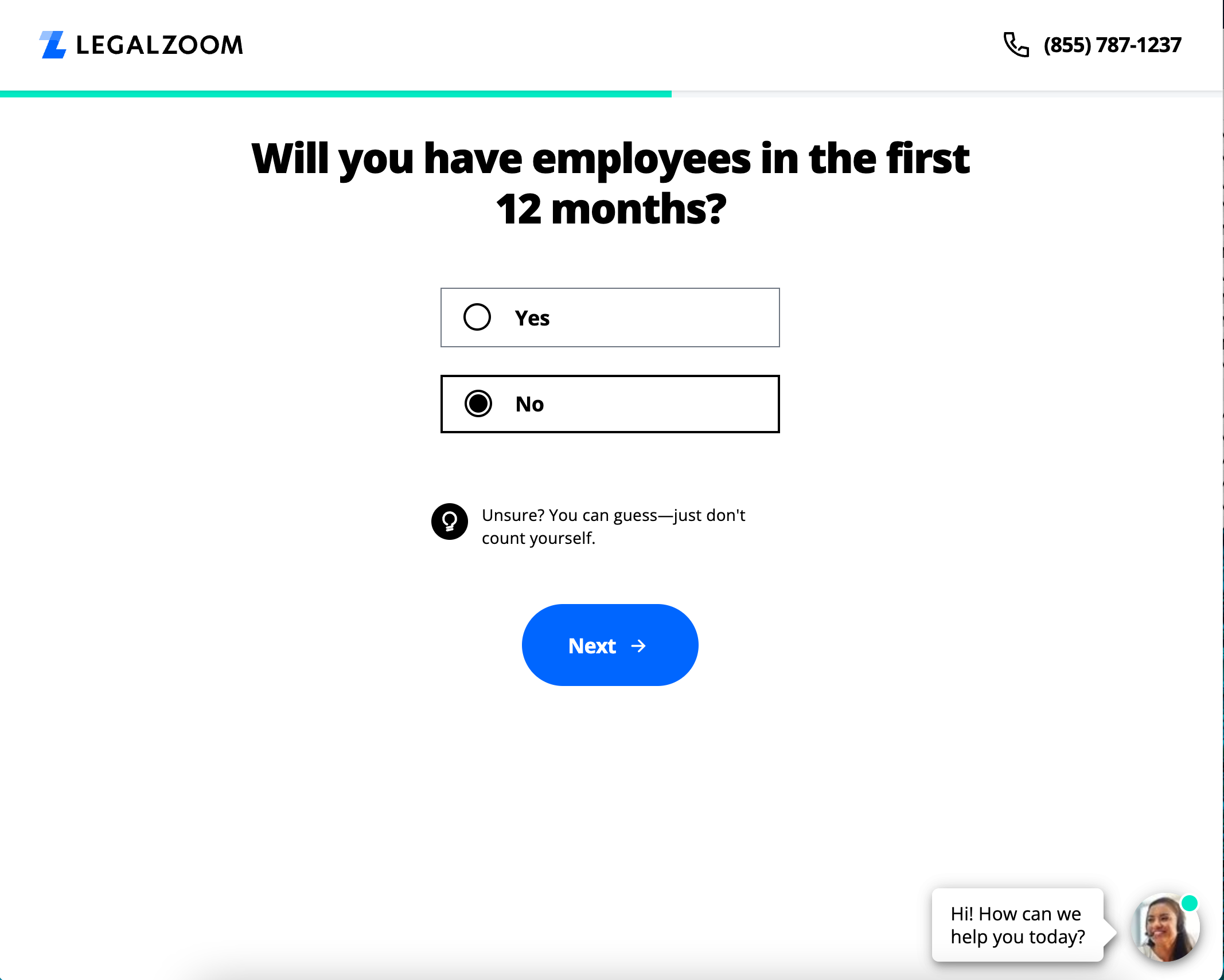 LegalZoom’s flow for forming a new LLC (limited liability company). A user would start this flow after entering their business name on a product marketing page: