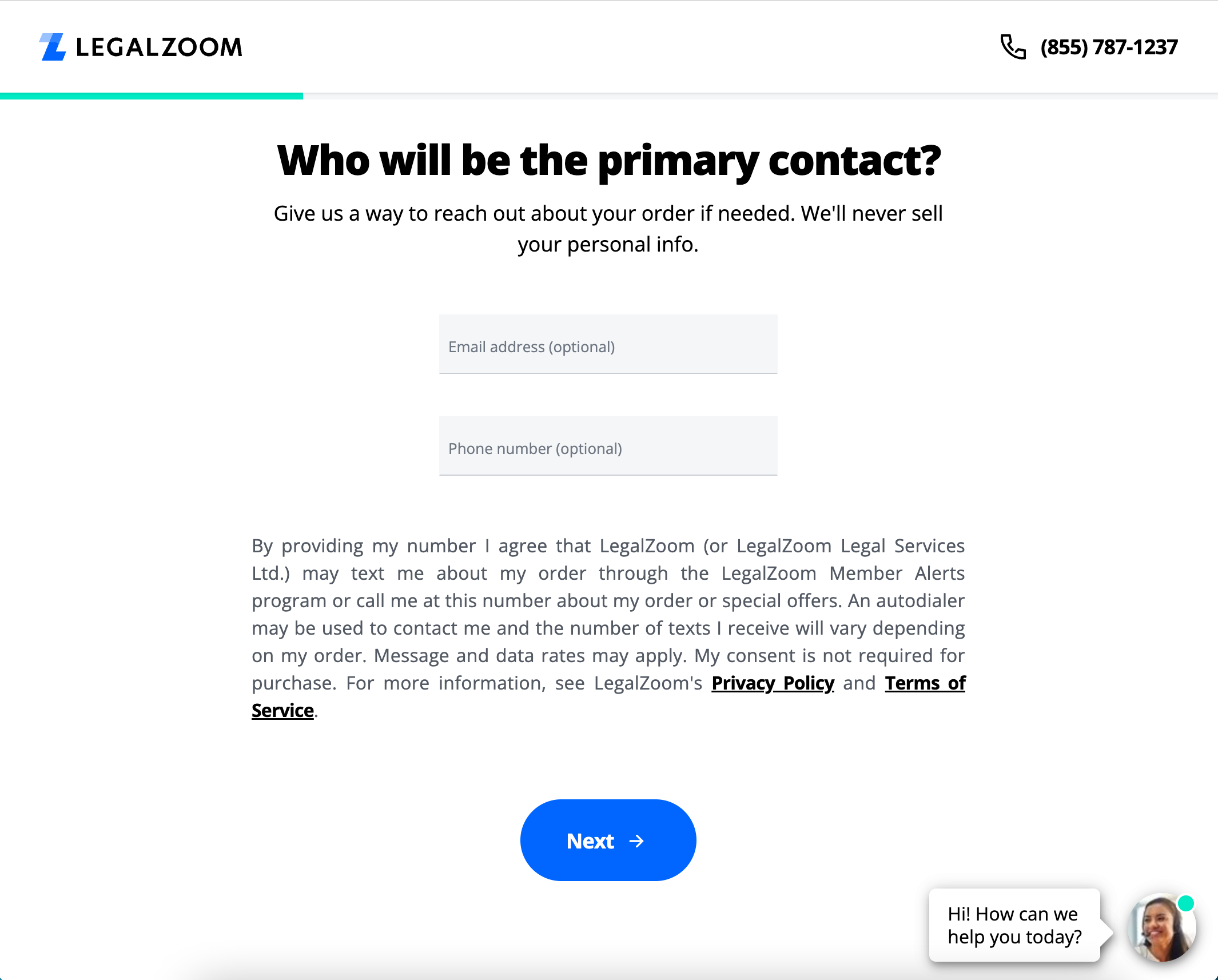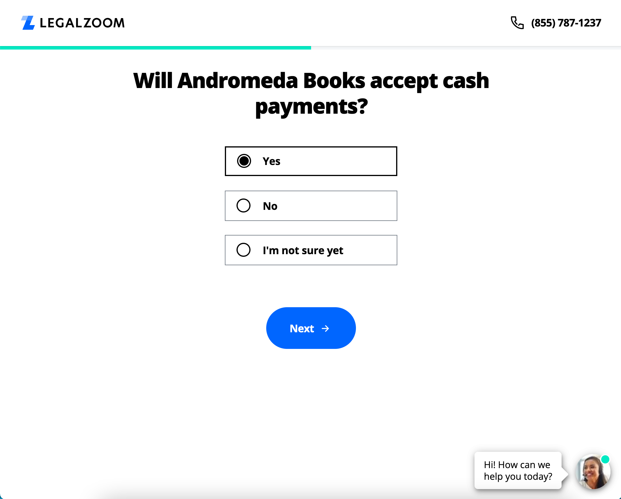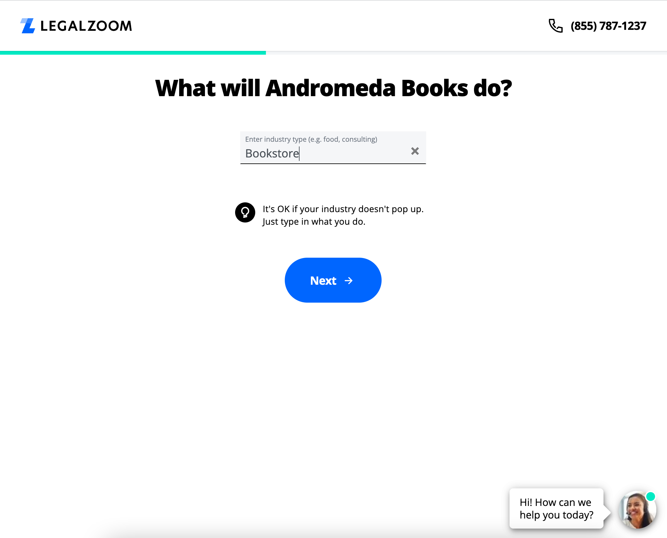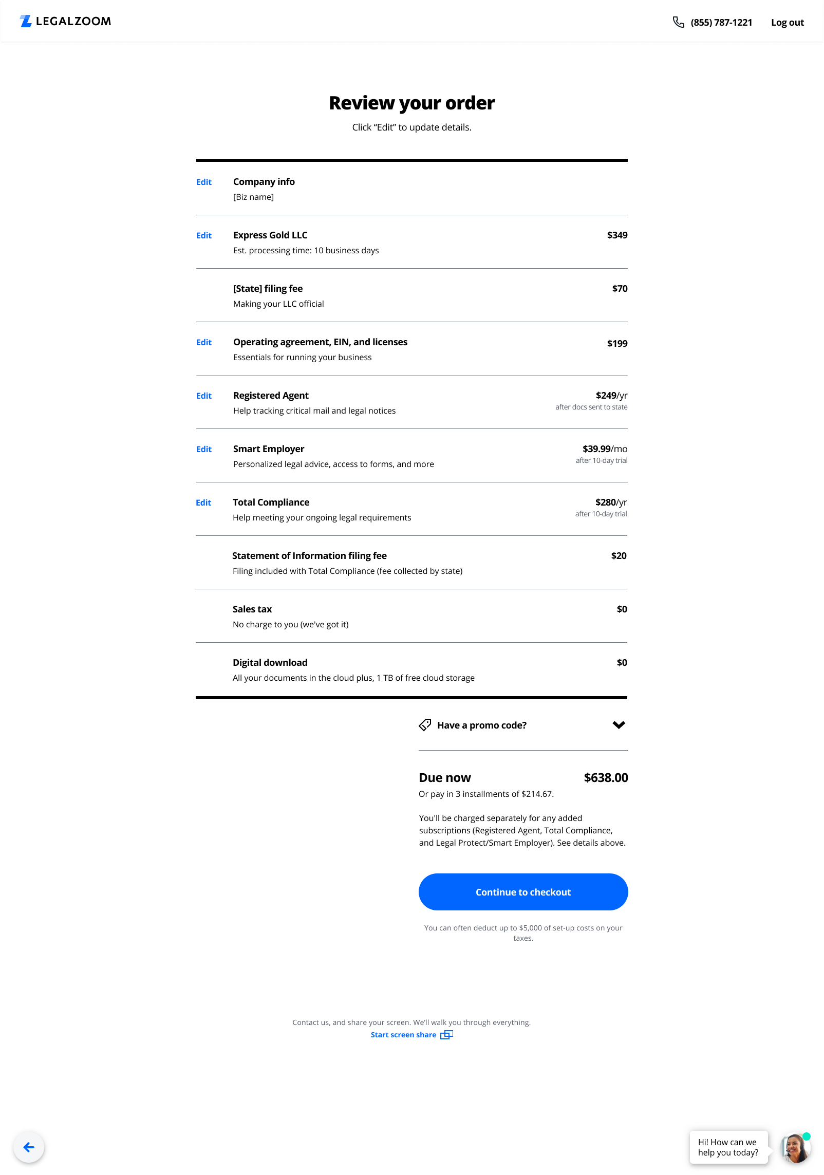 LegalZoom’s flow for forming a new LLC (limited liability company). A user would start this flow after entering their business name on a product marketing page: