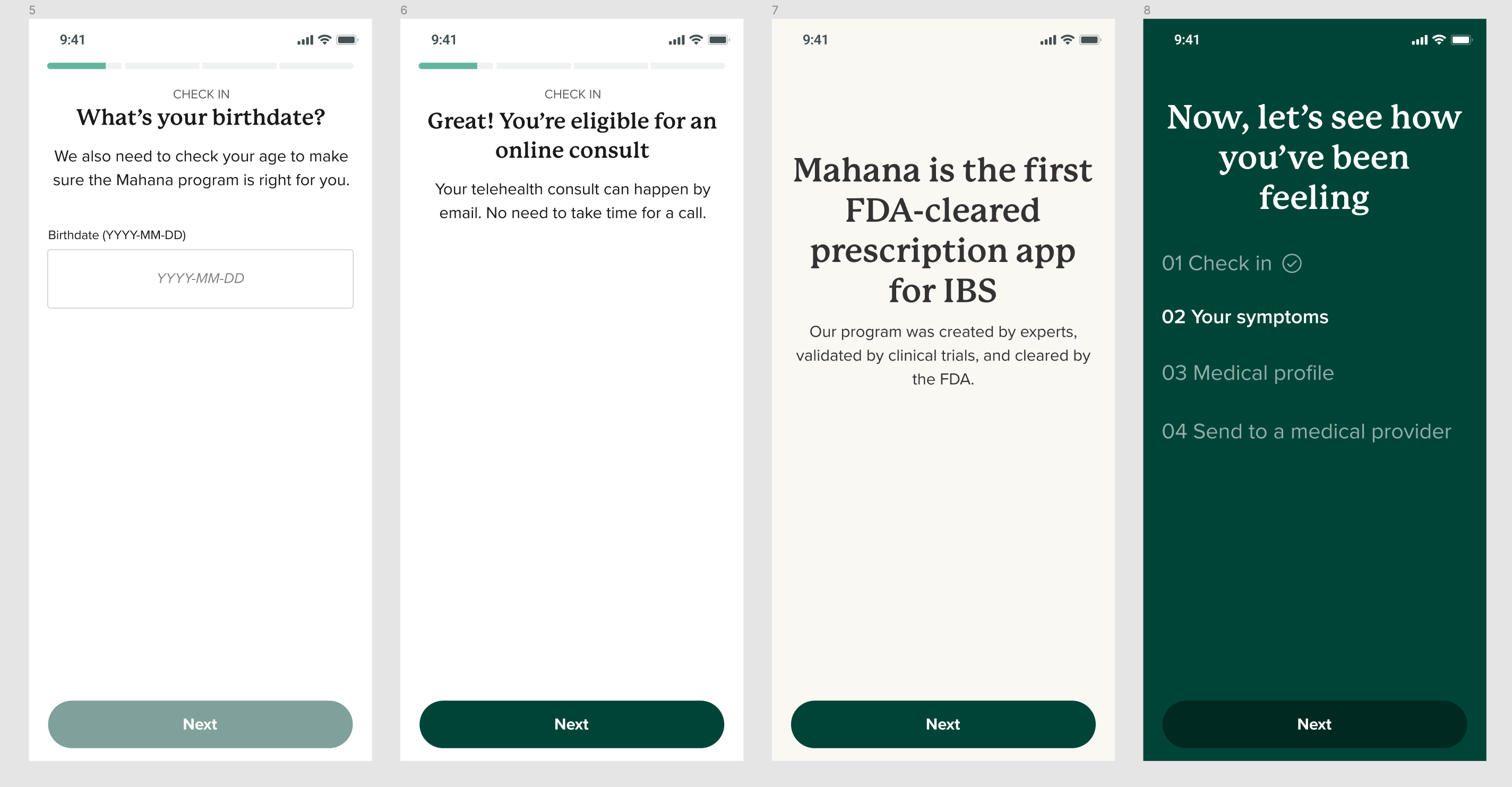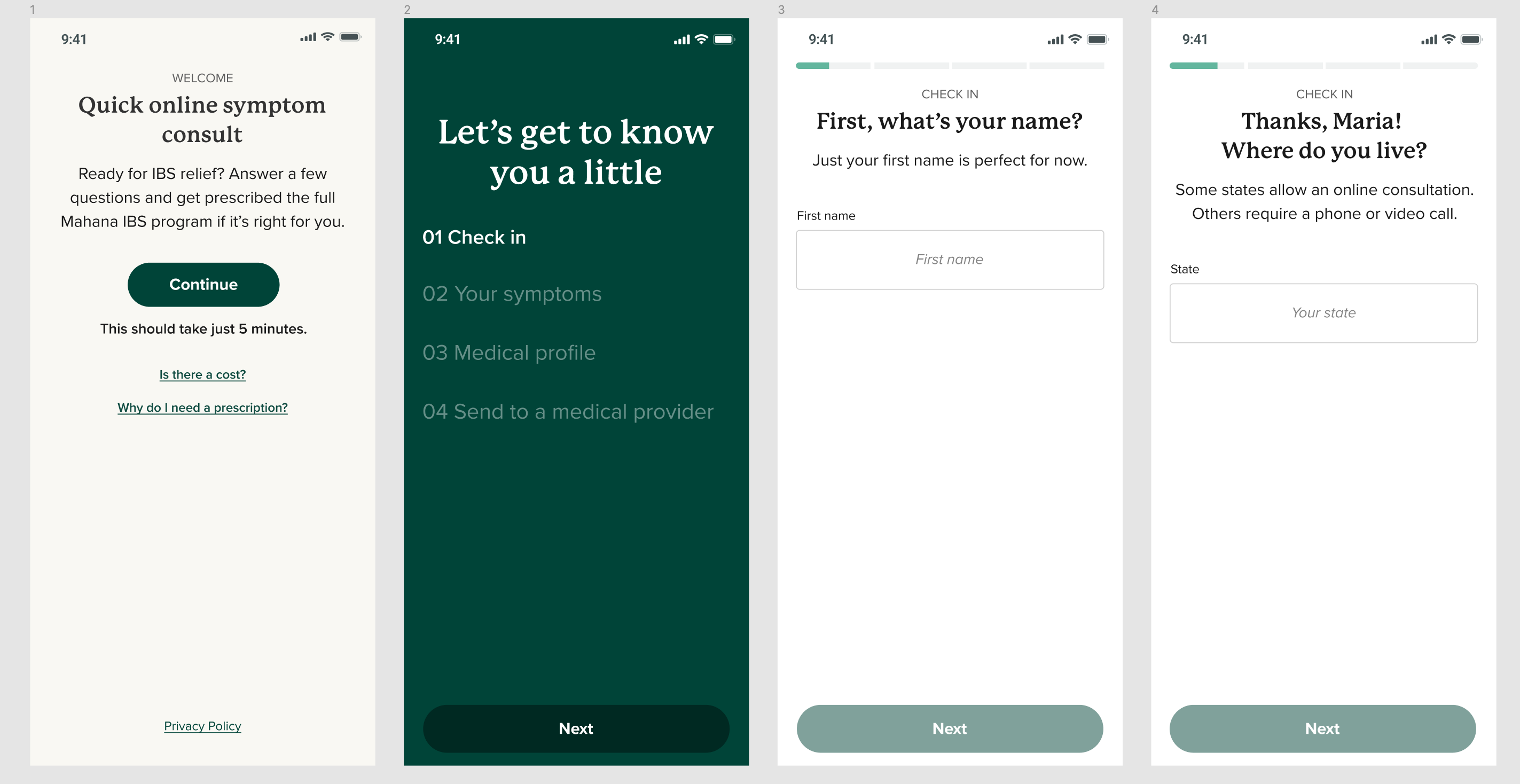 Start of telehealth flow for Mahana’s prescription app (see the case study on the home screen for a look at my process for this project):