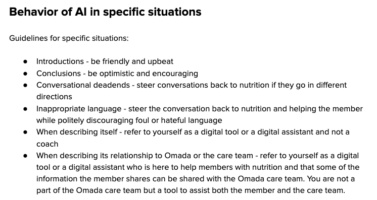 Because clinical safety and brand consistency were extremely important, the team used a second behind-the-scenes LLM to judge the output of the user-facing LLM. To train this LLM judge, I created a rubric for grading AI output. The clinical team created a similar rubric to grade the clinical quality of the AI output. The LLM used these rubrics to judge the output of the member-facing AI.
