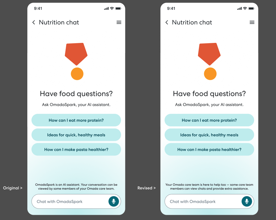 The legal team wanted users to understand that human care team members could view their chats. The original version (left) framed this in a way that could feel scary or invasive. The revised version (right) reframed it as a benefit, since care team members can follow up and provide more in-depth support.